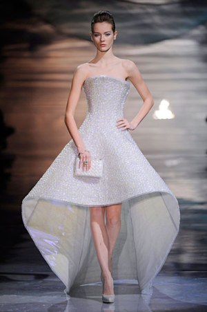 If there is a such thing as being too cohesive, I think Armani Prive’s collection was exactly that. I don’t think Paris Fashion Week is the time to send nearly identical looks down the runway. The overall collection had a wide range, but so many of the outfits were barely distinguishable from one another. But my pulse still races when I see this dress. The model is working it, it’s incredibly beautiful, and even though it doesn’t look like Lady Gaga’s Grammys dress, it feels so similar, like they were both made out of the same recyclable materials to become something extravagant.