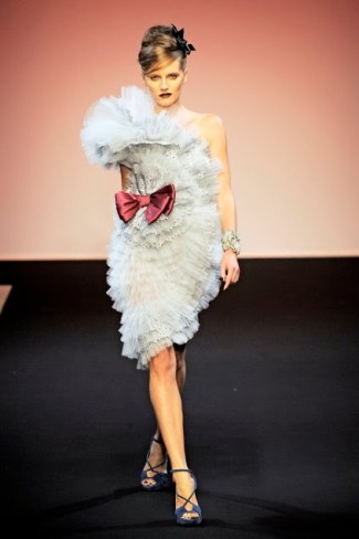 One of the more original looks of the collection, though between the white and champagne frilliness, the red bow, and the blue shoes, I can’t see anyone wearing this outside the holiday season. You can still sense a sort of Marchesa-meets-McQueen feel to it, but it seems more original and inspired than the others. But that may be because this model is basically wearing a crinoline taco.
