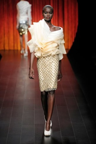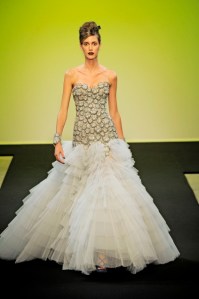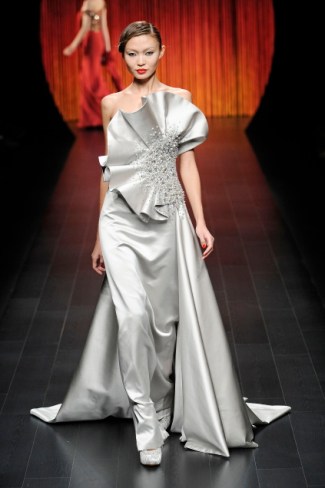 I want to punch that model in the face for walking with such an unattractive hunch – you’re a fucking runway model, for God’s sake, it’s your JOB to stand up straight, keep your shoulders back, and live on a diet of cigarettes and cocaine. But that ruffled sunflower piece is simply majestic. I just wish the dress either ended there, because it feels like Hobeika was so caught up in the impeccable creation of the top half of the garment that he simply gave up on the bottom. The skirt just sort of hangs there lifelessly, making an otherwise complex and beautiful gown look sloppy and unfinished. Unfortunately, this was a mistake he repeated.