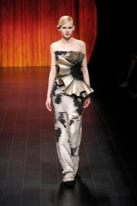 Easily the most likeable, the most wearable, and therefore the most boring piece in Georges Hobeika’s fascinating and often inspiring haute couture collection. Not that this would qualify as boring under normal circumstances; it’s still high fashion and gorgeous, but it’s certainly nothing new. The tissue-paper draped blouse has been done in countless ways (but I give Hobeika credit for making it more beautiful than most). And the skirt is gorgeous and gives off a fabulous Middle Eastern feel (Hobeika is, after all, Lebanese). But take a look at the next few photos and you’ll see how much more he is capable of.