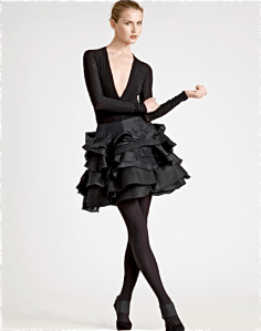 I’ve yet to feature a skirt on Diva’s Choice, but when I saw this fabulous little number, I knew she deserved the spotlight. With or without the signature black tights and leotard, this ruffled skirt from Donna Karan is clearly fit for a ballerina. (At two grand for the skirt, 800 for the leotard, and 52 for the tights, it’s clearly fit for the world’s wealthiest ballerina, but I digress.)