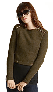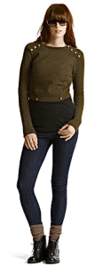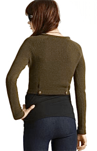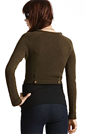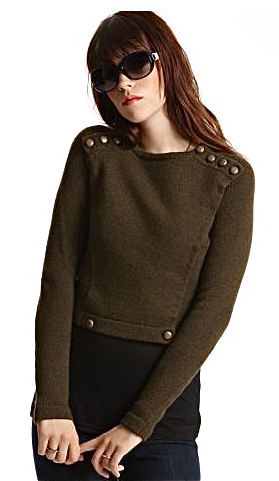 Let’s start with the fabulous color – your basic military camouflage greenish brown. A good greenish brown piece is important to own – light enough to wear with black pants, but also looks great with blue jeans. And the buttons on the shoulders? Adorable. They make the sweater feels funky downtown vintage/Salvation Army, but the tailoring (especially in the back) is ultramodern. The cut is boxy and masculine (there’s your military inspiration)t, but the tight fit and cropped silhouette keep it feminine and just plain adorable.
