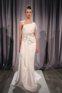 Oh, lord. This dress is as basic as basic gets. The only actual design aspect is that sad little shoulder piece; the rest is an endless nightmare of white. Did she really think she could just wrap white fabric around her model and call it a day?