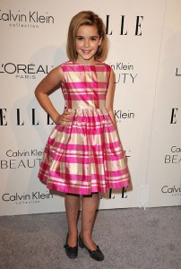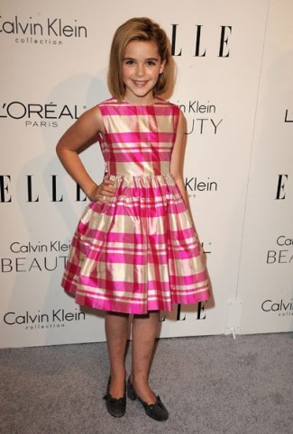 Perfection. Cool hair, flawless makeup, and a truly fabulous little dress. I love that the purse, the dress, and the shoes are all black with a hint of gold bling. (Well, perhaps a bit more than a hint.) And best of all, she looks so at home in this, like she’s more comfortable in bejeweled McQueen than in her pajamas.