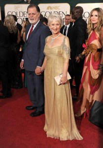 This was so much worse on camera, because Sandra has clearly had some badly botched plastic surgery lately and she couldn’t move a single muscle in her face. I think that’s why she went with those awful bangs, which many bloggers said were probably clip-on – yes, CLIP-ON BANGS. ON THE RED CARPET. AT THE GOLDEN GLOBES. I might throw up.