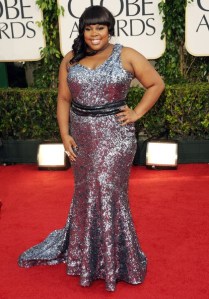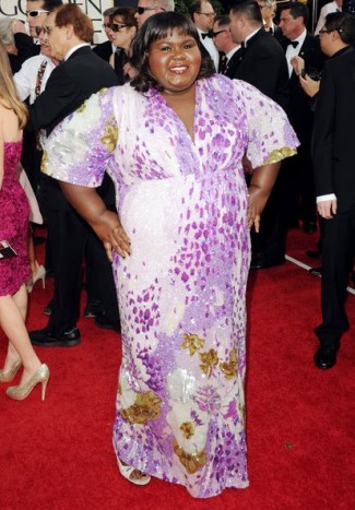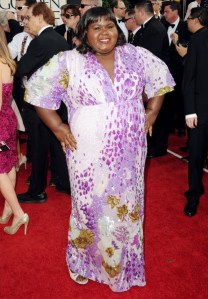 That is the ugliest print I’ve ever seen. I want to know who turned to Precious and said, “You know what would look AMAZING on you? Giant purple leopard print. With sparkles. And gold flowers. And other random shit falling off the arms.”