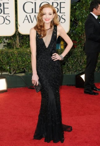 I understand that when you have to dress in cute little matchy-matchy cardigans and similarly twee outfits on set, the desire is to go dark and dramatic when you’re on the red carpet. But this is way too Elvira for a little mousy redhead to wear. Those hair extensions are nightmarish, and the different black textures against her white skin and red lips are just not working for me.