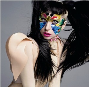 A very Gaga moment, between the alien-bodysuit shoulderpads and the glittering rainbow face mask. But it all works (except, of course, that rat’s nest of a wig).
