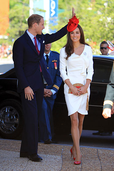 The hat we love. Close-up, you can see it’s got a maple leaf thing happening, because she wore it in Canada on Canada Day, which is actually very sweet. But to pair it with a white dress, a red purse, and red shoes is a bit much, even for a princess. I understand that women in certain positions – royalty, First Ladies, etc. – have to dress a little matchy-matchier than a lot of other famous women. But there’s looking appropriately and demurely put together, and there’s looking downright silly, and Kate is leaning towards the latter with this look.