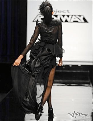 This dress was perfectly adorable. I thought the giraffe print was fabulous and kitchy and used well, and I think this silhouette is perfect for a red carpet movie premiere. I agreed with the judges that the bodice was strangely constructed and the fabric looked tucked into the dress, rather than actually hemmed. But that was quickly a last-minute fix rather than a design element, so I don’t think they necessarily needed to come down on her too harshly for that. What they should have criticized is her need to tape six yards of fabric to her model’s head and call it a fascinator. Don’t get me wrong, I love a good head piece; the weirder, the better. But when you hap-hazardly make these little crinoline head pieces with no consideration of shape, size, or proportion, you’ve just got a model strutting down the runway with a loofah on her head. Maybe if she made the same head piece, but 1/4 the size and with some semblance of construction, I’d approve.