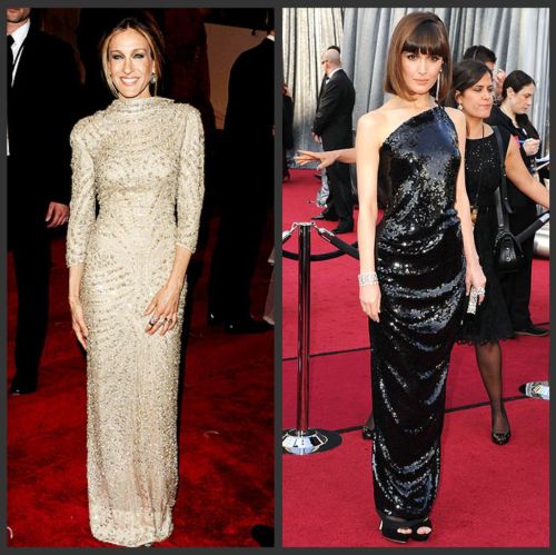 SARAH JESSICA PARKER: gown by Alexander McQueen // ROSE BYRNE: gown by Vivienne Westwood, purse by Chanel, shoes by Jimmy Choo