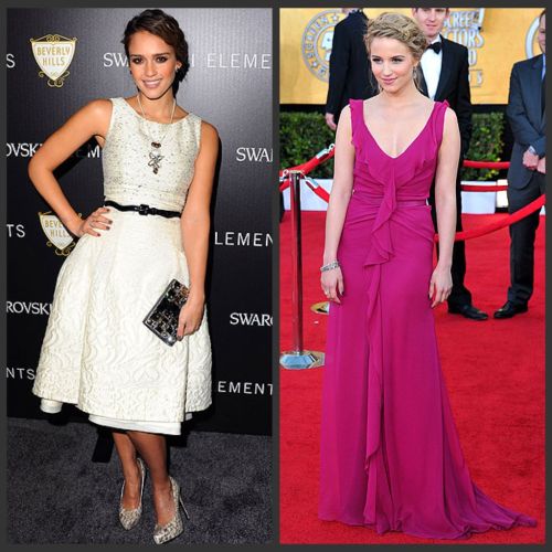JESSICA ALBA: dress by Carolina Herrera, purse by Jimmy Choo, shoes by Giuseppe Zanotti // DIANNA AGRON: dress by Michael Kors