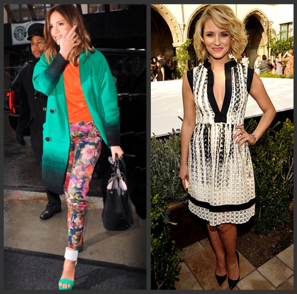 When the girls go more casual, it’s Ms. Alba’s colorful solids and prints versus Ms. Agron’s adorable black-and-white look.