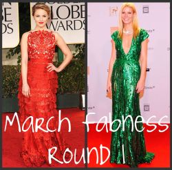 Two girls, one event: the Golden Globes. Do you prefer the soft, romantic beading on the mauve Gucci gown or the lazer-cut swans and ruffles on the red Giles Deacon gown?