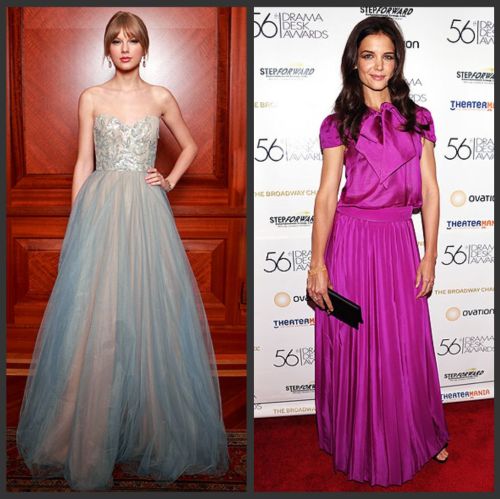 TAYLOR SWIFT: dress by Oscar de la Renta, shoes by Prada // KATIE HOLMES: dress by Contrarian, shoes by Lanvin