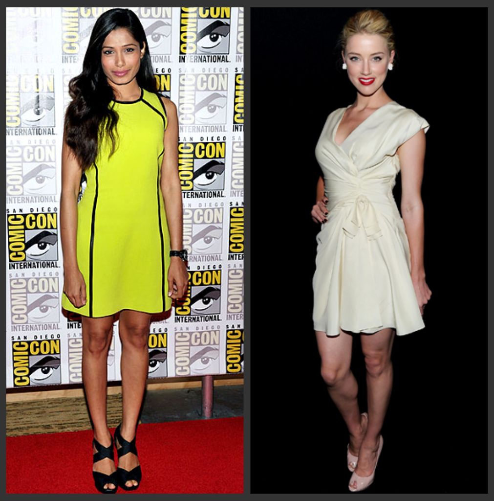 FREIDA PINTO: dress by Lanvin // AMBER HEARD: dress by Reem Acra, shoes by Christian Louboutin