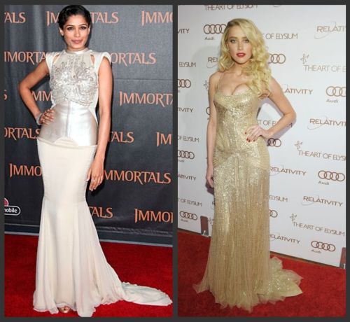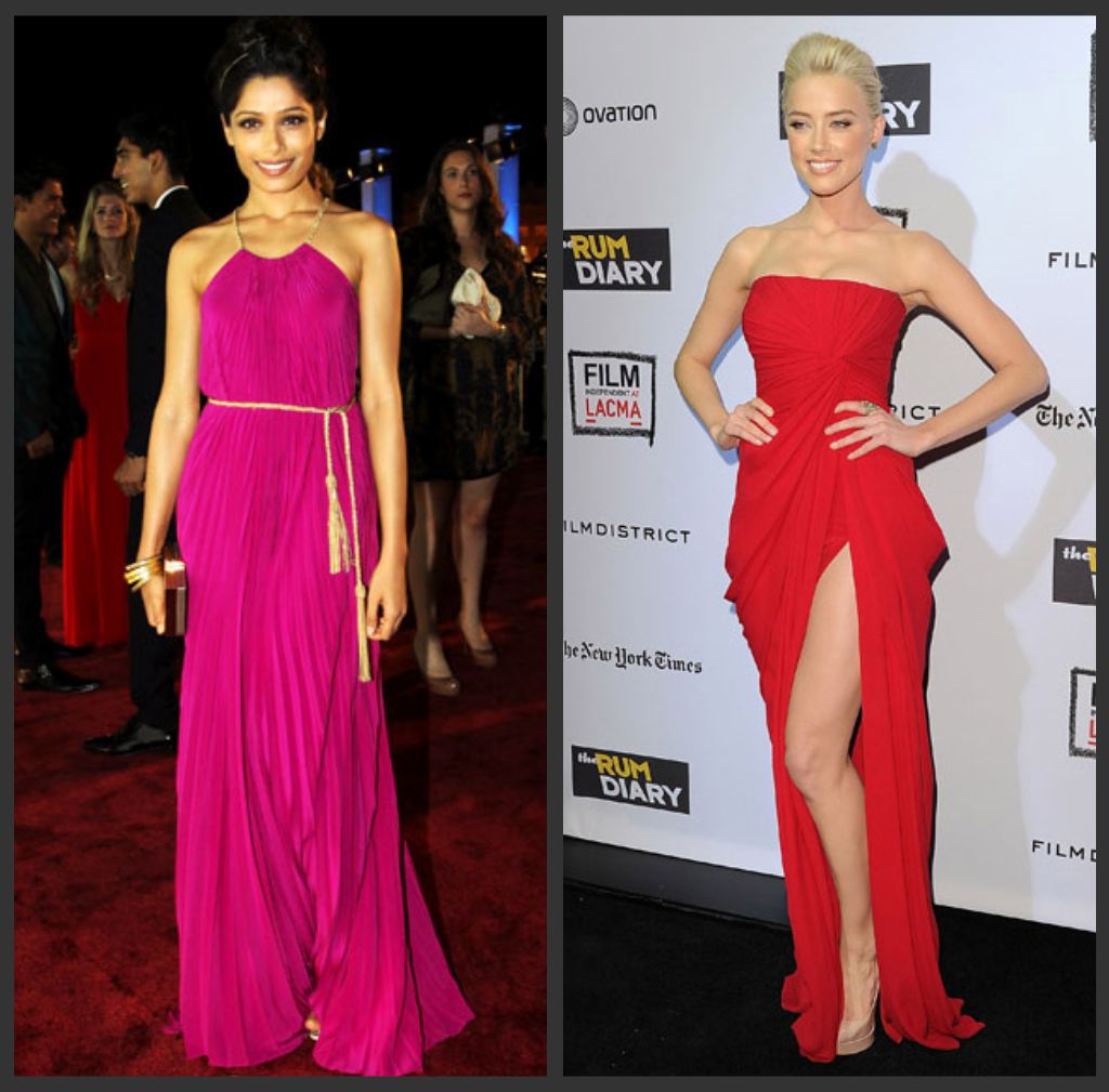 FREIDA PINTO: gown by Antonio Berardi // AMBER HEARD: gown by Donna Karan