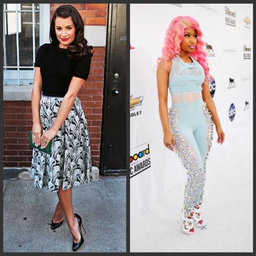 A hilarious battle if there ever was one, Lea Michele’s “look how demure I am” ensemble fights Nicki Minaj’s Lady-Gaga-at-the-gym outfit. Do you applaud Nicki’s daring jumpsuit, or do you prefer Lea’s 1950s throwback?