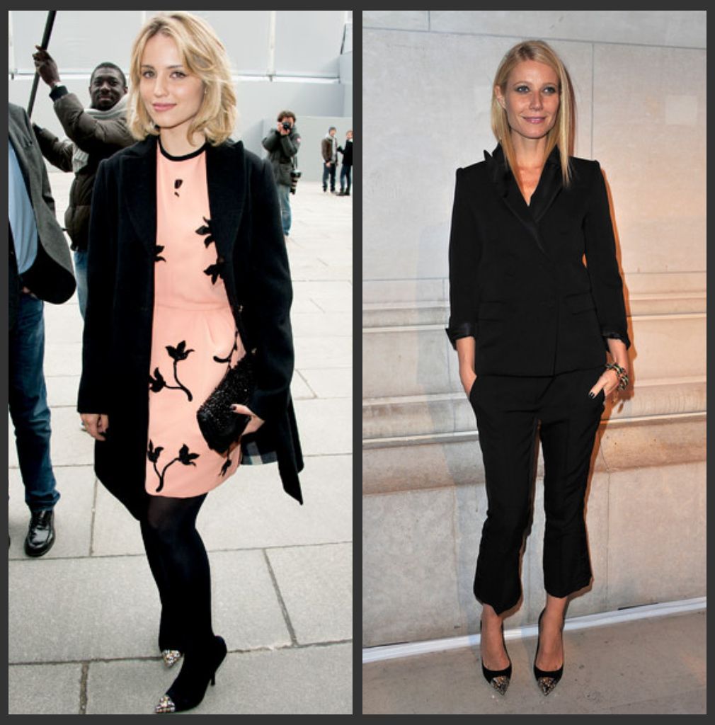 When in Paris, don Louis Vuitton, especially when you’re at the label’s fashion show (Dianna) or exhibition (Gwyneth). Both love black separates by the label and fantastic cap-toed shoes. Do you dig Ms. Agron’s sweet peachy-pink dress, or Gwyneth’s menswear-inspired style?
