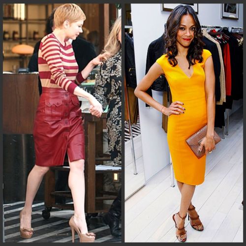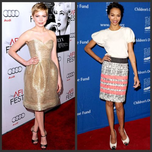 MICHELLE WILLIAMS: top and skirt by Jason Wu, shoes by Miu Miu // ZOE SALDANA: dress, purse, and shoes by Michael Kors
