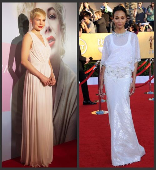 MICHELLE WILLIAMS: gown by Miu Miu // ZOE SALDANA: dress by Jason Wu, purse by Kara Ross, shoes by Brian Atwood