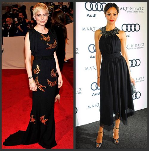 How do you embellish a lovely black dress? Are you charmed by the whimsical print on Michelle’s Miu Miu gown, or do you opt for the gorgeous embellished neckline on Zoe’s Jason Wu dress?