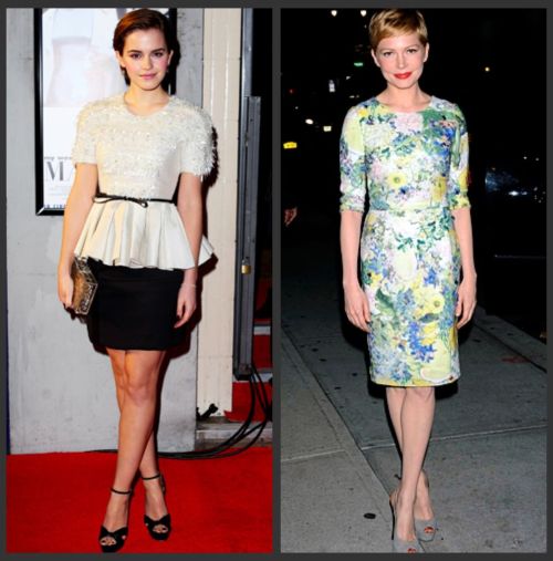 EMMA WATSON: top and skirt by Jason Wu, purse by Charlotte Olympia, shoes by Jimmy Choo // MICHELLE WILLIAMS: dress by Erdem, shoes by Giuseppe Zanotti