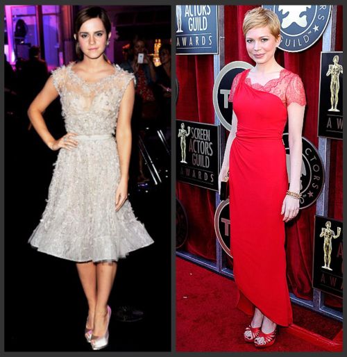 EMMA WATSON: dress by Notte by Marchesa // MICHELLE WILLIAMS: dress by Erdem, shoes by Roger Vivier