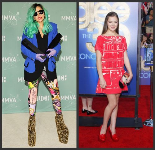 Hailee: Well, Mother Monster, I’m a bit too afraid of you to even try and talk you out of those leggings. So I’ll just quietly counter with an adorably cartoonish look of my own, from my red graphic dress to my shiny platform loafers.