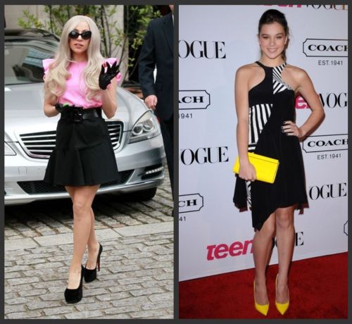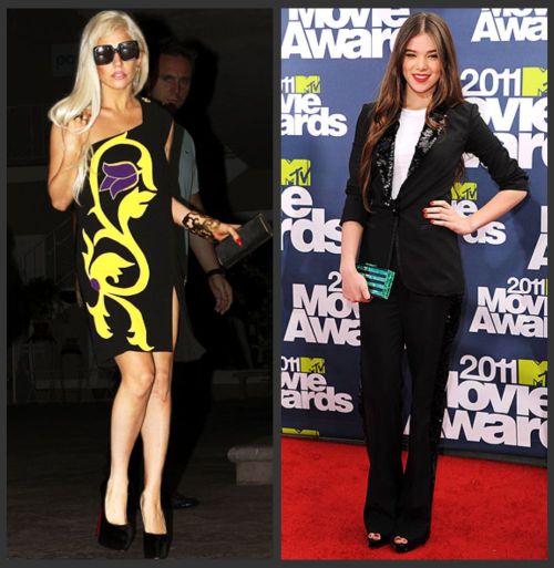 LADY GAGA: top and skirt by Yves Saint Laurent, shoes by Christian Louboutin // HAILEE STEINFELD: dress by Versace