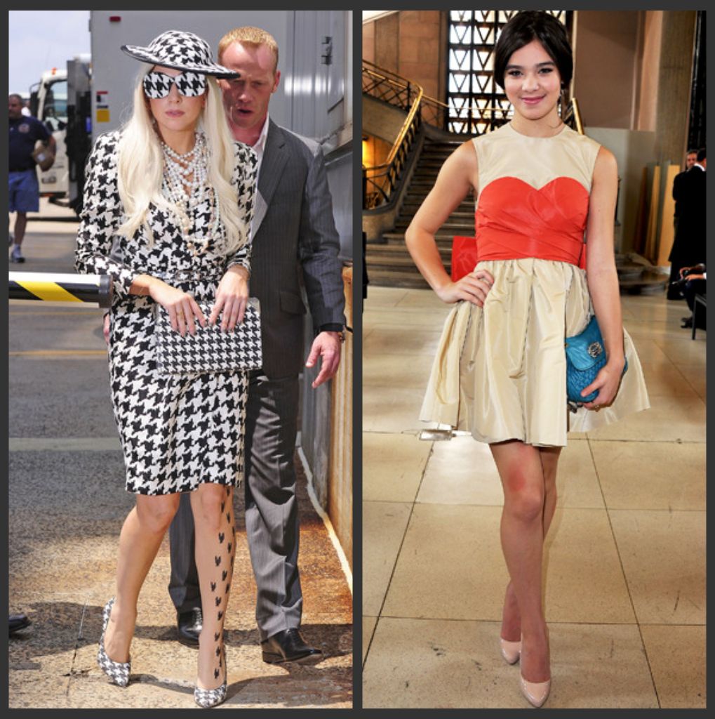 LADY GAGA: blouse and skirt by Versace // HAILEE STEINFELD: dress, purse, and shoes by Chanel