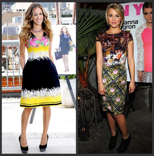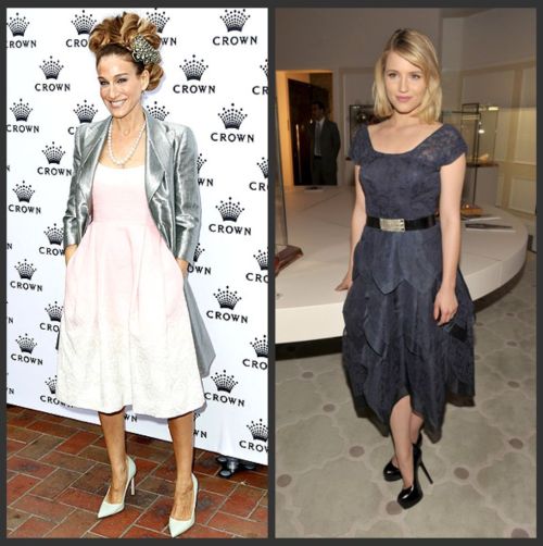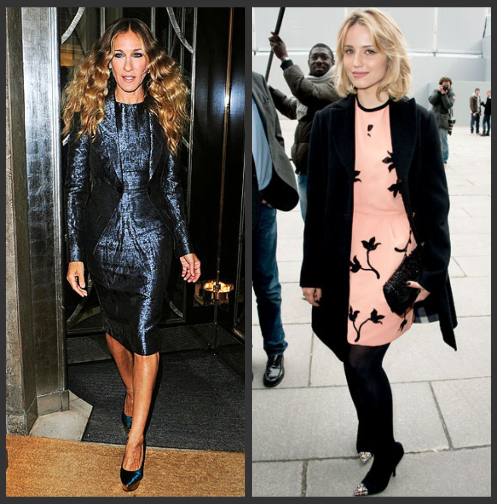 SARAH JESSICA PARKER: dress by Jonathan Saunders, coat by Alberta Ferretti, shoes by Manolo Blahnik // DIANNA AGRON: vintage dress, shoes by Yves Saint Laurent
