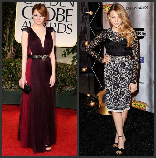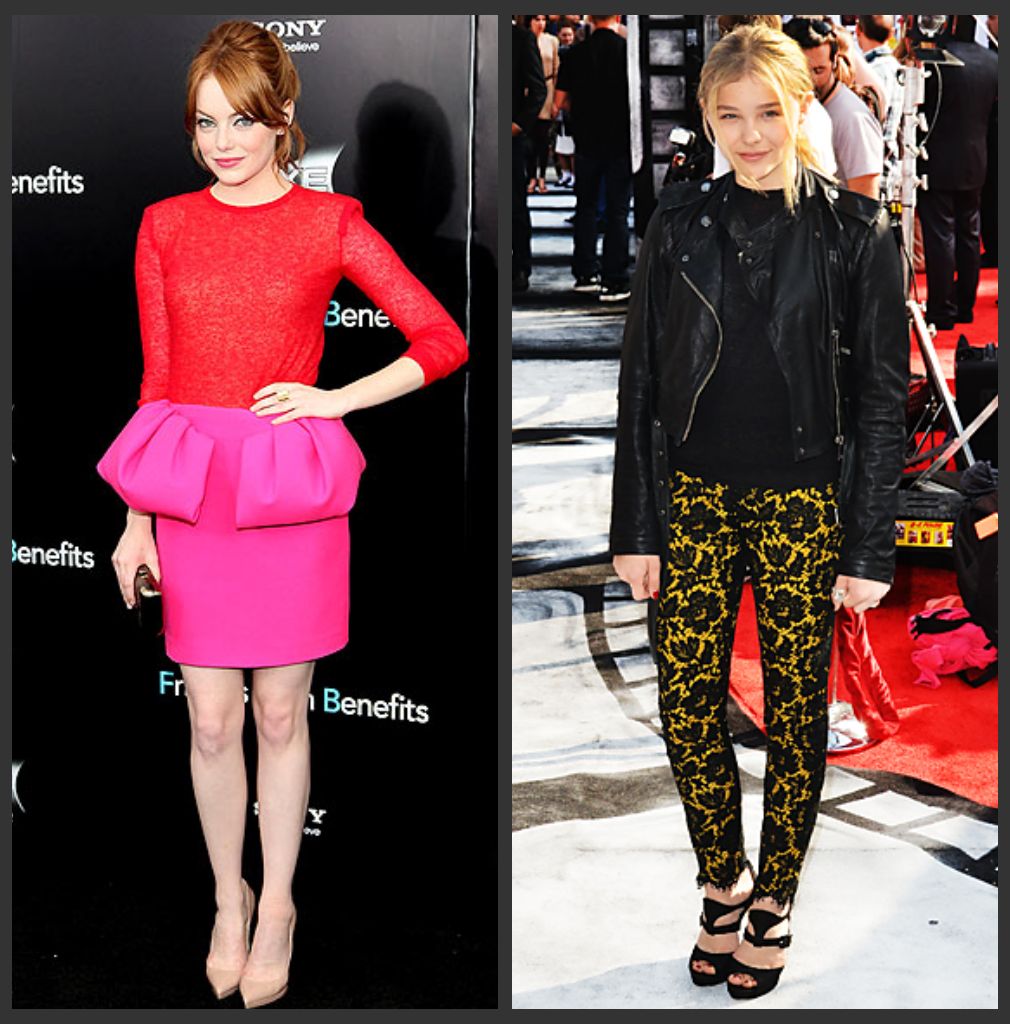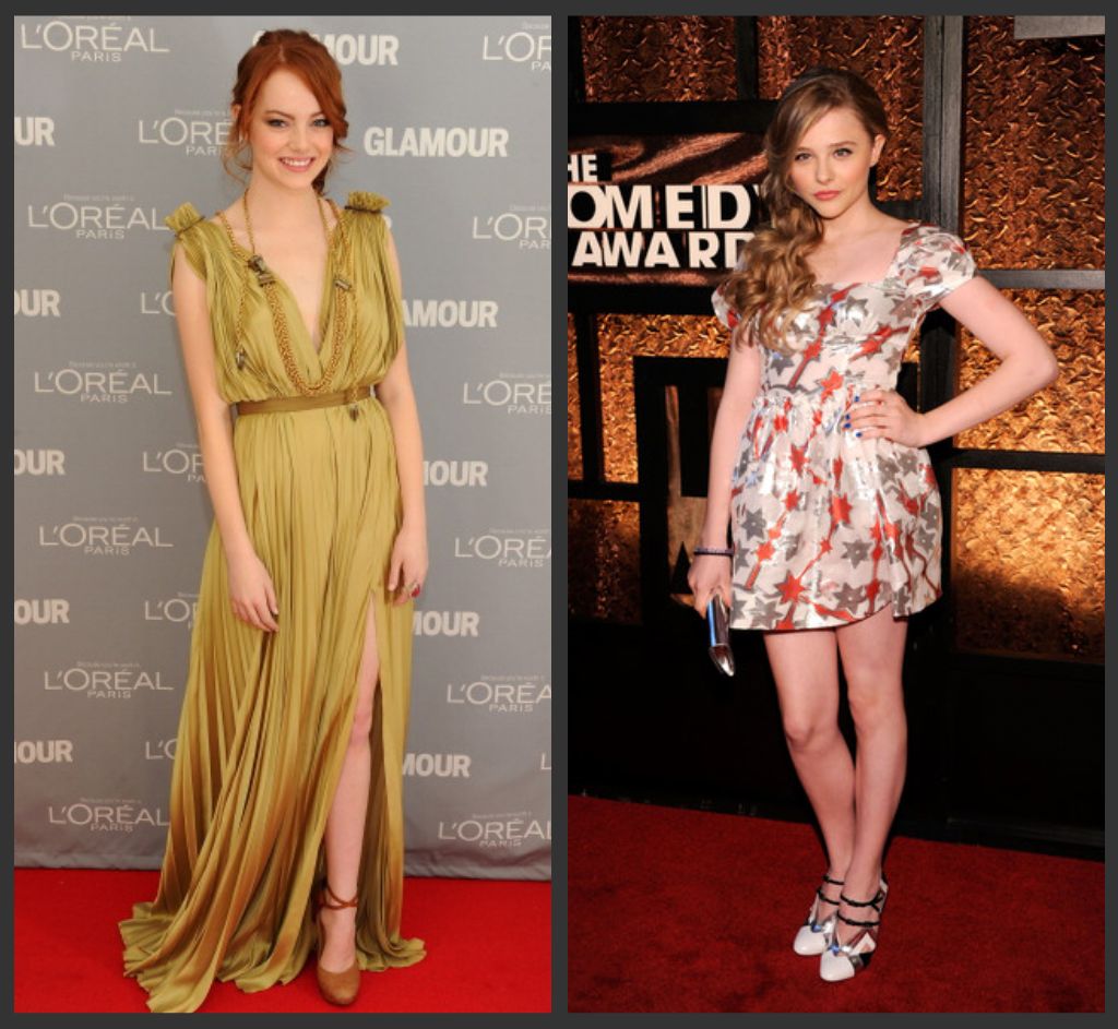 EMMA STONE: gown and shoes by Lanvin // CHLOË MORETZ: dress and shoes by Miu Miu