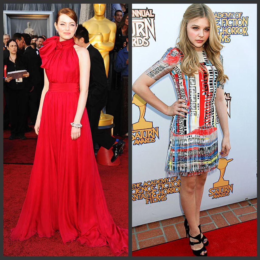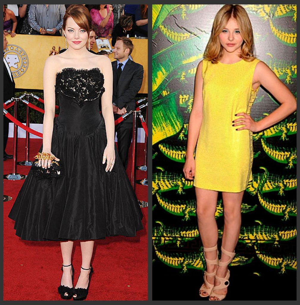 EMMA STONE: dress, purse, and shoes by Alexander McQueen // CHLOË MORETZ: dress by Versace for H&M, shoes by Versace
