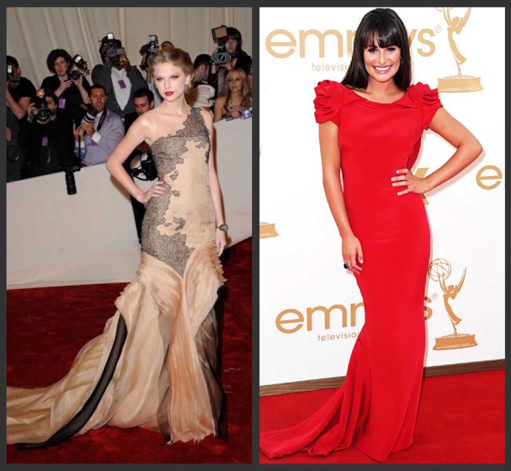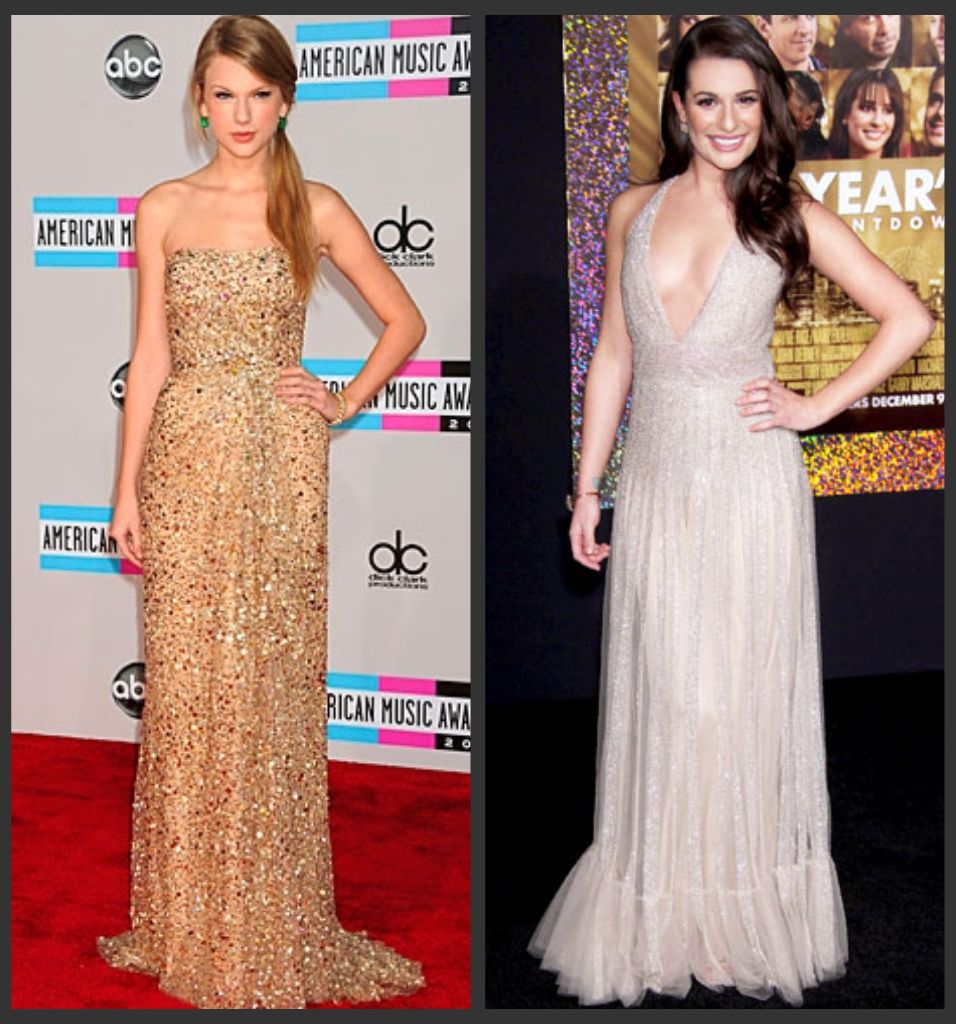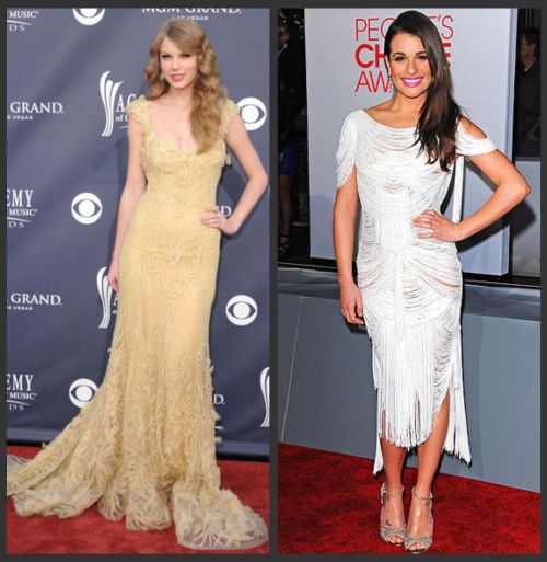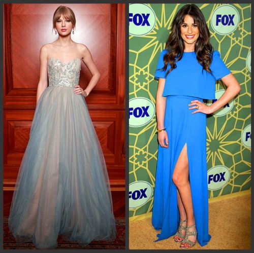 TAYLOR SWIFT: gown by Reem Acra // LEA MICHELE: gown by Valentino