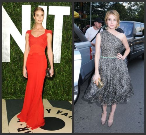 ROSIE HUNTINGTON-WHITELEY: gown by Antonio Berardi, purse by Jimmy Choo // EMMA ROBERTS: dress by Marchesa, shoes by Brian Atwood