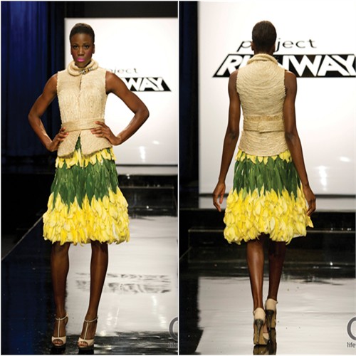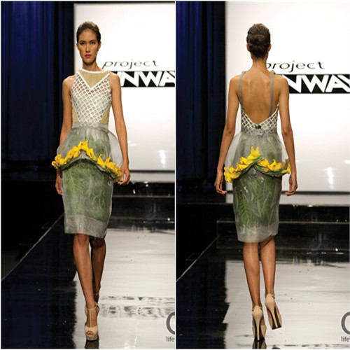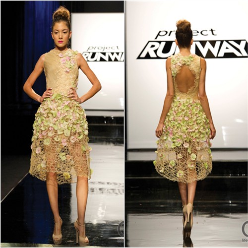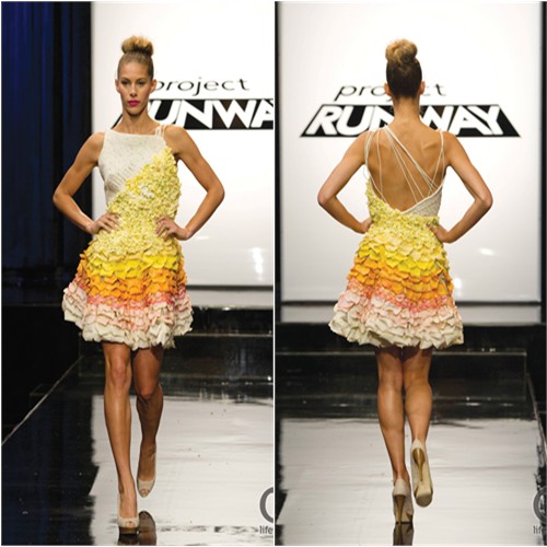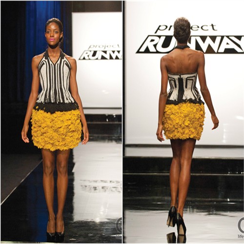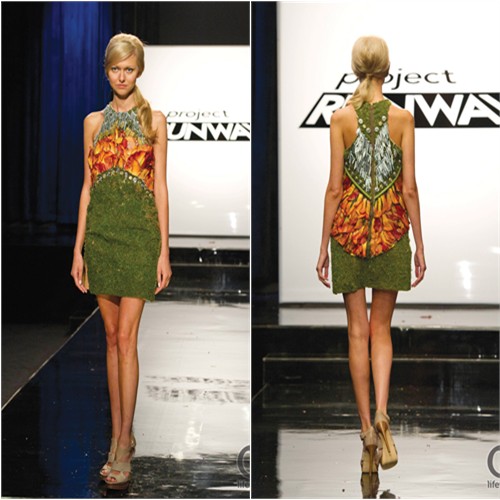 In almost a decade of Project Runway, I don’t think I’ve seen an idea as creative as Samantha’s effect of trapping the flowers and leaves inside that wiry mesh. The way she was able to construct an entire knee-length skirt with a flattering peplum out of that material was impressive, but the yellow flowers adorning the outside and the inside of the peplum looked so incredible over the leaf-printed skirt. The bodice was equally innovative and extraordinarily flattering – it’s rare that the most thought-provoking idea is also the most flattering one, but Samantha’s construction skills clearly match her creative imagination. This team had a few hits, but Samantha’s blew everyone else out of the water.