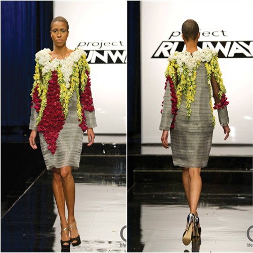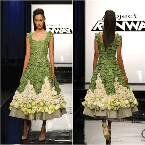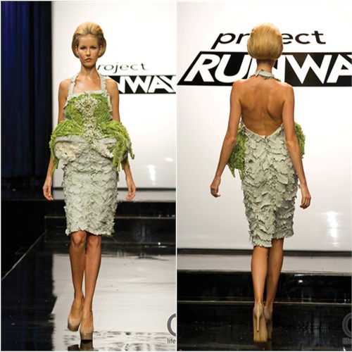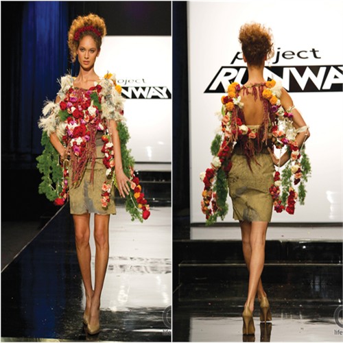 The Challenge: After the teams get re-shuffled, the designers are locked into a room filled with double-scented Glade candles until they’re stoned enough to create looks out of hardware AND flowers. (At least, that’s the only link I could find between shilling candles and making clothes out of nails and moss.)
