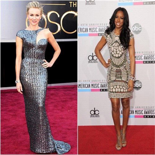 Naomi’s gown by Alexander McQueen, purse by Jimmy Choo; Kelly’s dress by Victoria Beckham, shoes by Christian Louboutin