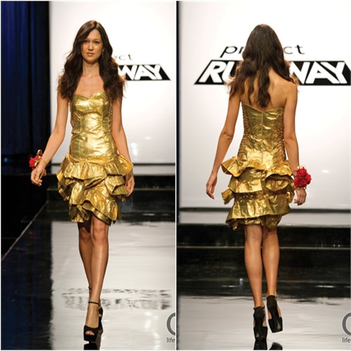 I still can’t quite believe this got the auf. I won’t pretend this photo does the dress any favors, but up close, you could see the interwoven denim duct tape design and it looked really interesting, textured, and lovely. This was also one of the only dresses I could actually imagine someone wearing to a prom. And Tu was the only person left on the show whose personality I actually enjoyed, so to lose him in a double-elimination for a pretty decent garment added insult to injury.