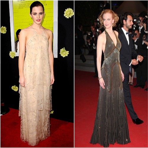 Emma’s jacket, dress, purse, and shoes by Miu Miu; Nicole’s dress by Azzedine Alaïa, shoes by Manolo Blahnik