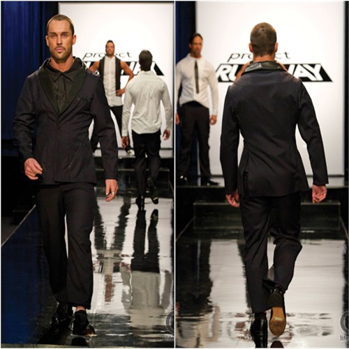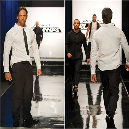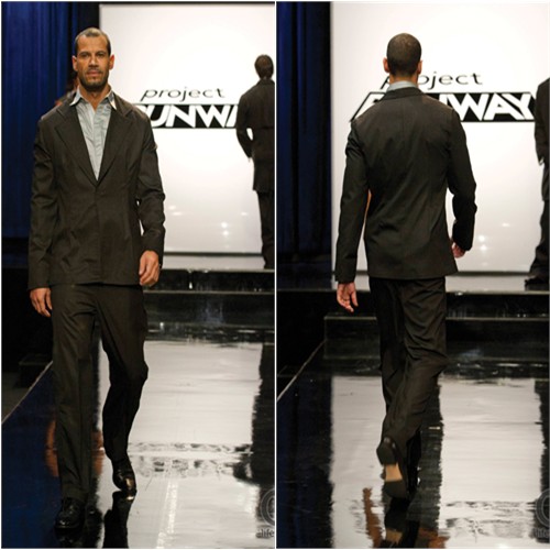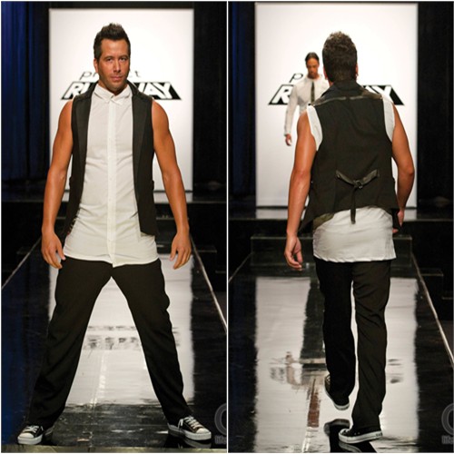 During the critiques, these pants were literally falling off the model while he was standing on the runway. You kept hearing this awful Velcro noises and he’d suddenly grab himself, and that’s when Nina started REALLY losing it. Like, laughing-til-you-cry kind of losing it. I swear, I thought she was going to fall off her chair. But aside from the model being unable to control the timing of his striptease because of how shitty those pants were, there was nothing enjoyable about this look. That – well, you can’t really call that a collar, right? The fit of that shirt is atrocious, and that sad, sad little tie – somewhere backstage, Tim Gunn was weeping at this so-called menswear.