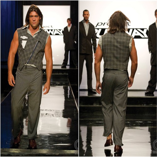 Halfway through Michelle’s never-ending rant about how sexy bike messengers are, my boyfriend yelled at the television, “WE GET IT! YOU’RE FROM PORTLAND!” Yes, this vest was basically the only interesting thing on the runway, but the shortness of it looks positively comical, as do the little tissues or whatever is stapled to his right man-boob. And those sad, sad pants – long in the crotch, and baring way more ankle than any pair of men’s pants should.