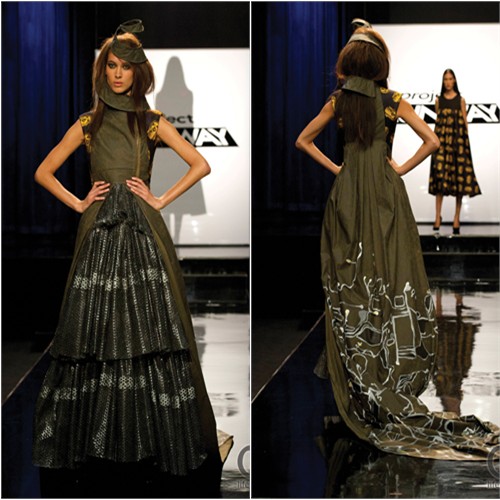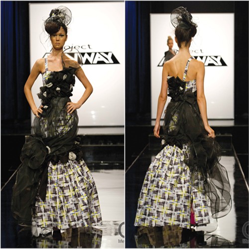 Michelle (and Stanley) made the best attempt at the “wearable art” look, though I think it had one or two too many design elements. The painting on the train was beautiful and looked fabulous on the runway, but the headpiece feels like excess. I think the skirt should have been two tiers instead of three – eliminating that little semi-peplum would have helped.