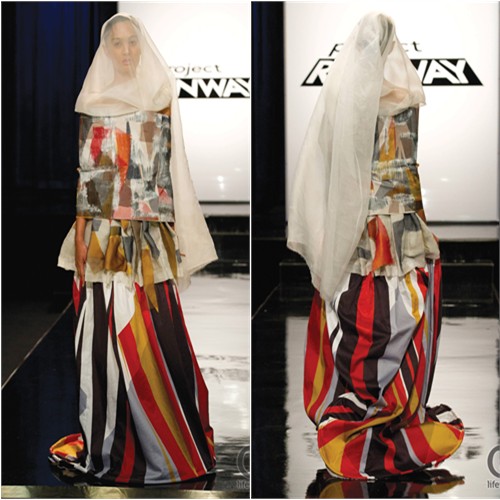 First of all, what Heidi called a “veil” (and considered beautiful) looks more like a burlap sack to me. The little pleated skirt portion is actually very nice, though I’m not sold on the straitjacket above it, but the stripes on that giant floor-length skirt look like something Ronald McDonald would wear. But I still thought Layana’s attempt at “wearable art” was much worse.