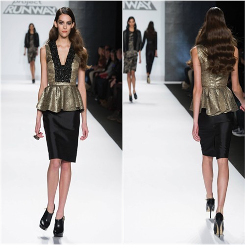 This worked much better as a top than the dress he presented it as during the last challenge, but he used that same matronly fabric from the first look’s pants to make this skirt. I think virtually any other material could have given this a chance of looking youthful, but his fabric choices are just so dated.