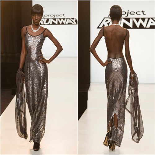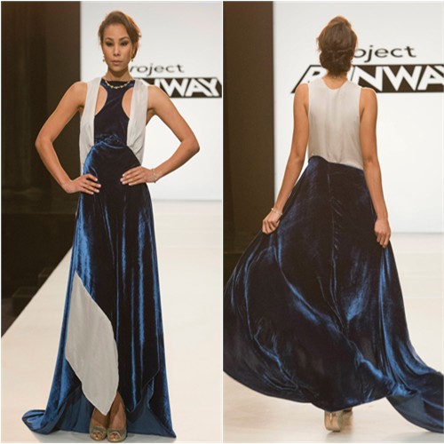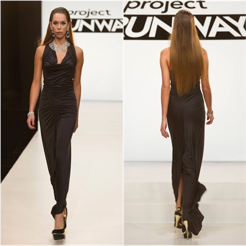 This was the clear winner, as far as I was concerned. I knew the judges wouldn’t give Bradon two consecutive wins in the first two episodes, because they need to show the rest of the designers or we’ll forget about them entirely. But his gown fit all three of my criteria for the win: it was well-constructed, it showed off the jewelry brilliantly, and it didn’t look like a thousand outfits I’ve seen come down the runways before. The fabric is stunning, just beautiful to look at, and the athletic silhouette at the top and the black trim give this a sportier, more modern vibe. The super-low, straight across backline is surprising and sexy, and even the little shawl was just lovely.