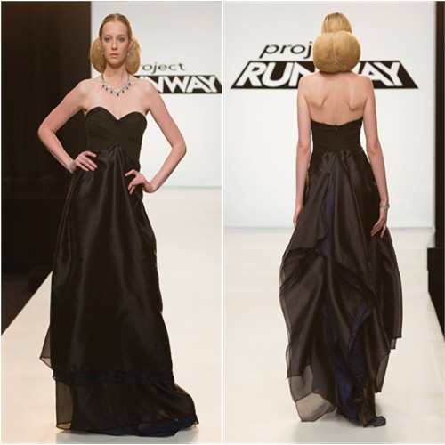 Beautiful and dramatic, yet simple enough to show off the jewels. I loved the construction of the bodice, which was incredibly flattering, and the touch of blue fabric in back to bring out the sapphires in the necklace was brilliant. It wasn’t quite as original as a few of the other looks, but this still would have been in the top for me. Also, Justin taking off his hearing aid so he didn’t have to hear the other designers bitching at each other was beyond hilarious.