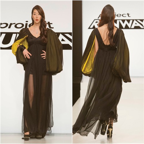 This look had a lot of beautiful movement on the runway that doesn’t show up in pictures, but it was still decidedly middle-of-the-road. I know Ginger Dandy’s goal was to make a dramatic garment, but those giant sleeves and all that movement might have distracted from the necklace instead of enhancing it. So I’m not sure it was a wise move for this challenge.