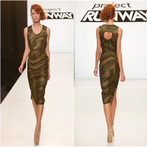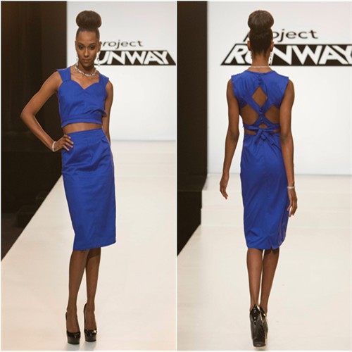 One of the designers called this a Vivienne Westwood knockoff, and I could not agree more. And it looked absolutely hideous on the runway, with those crooked, puckering lines going up the corset. Her boob appeared to be jumping through the television screen, she had giant pouches over her ass. I have an endless amount of complaints about the construction, and the idea lacks any originality. How that ends up in a win from the judges, I’ll never know.